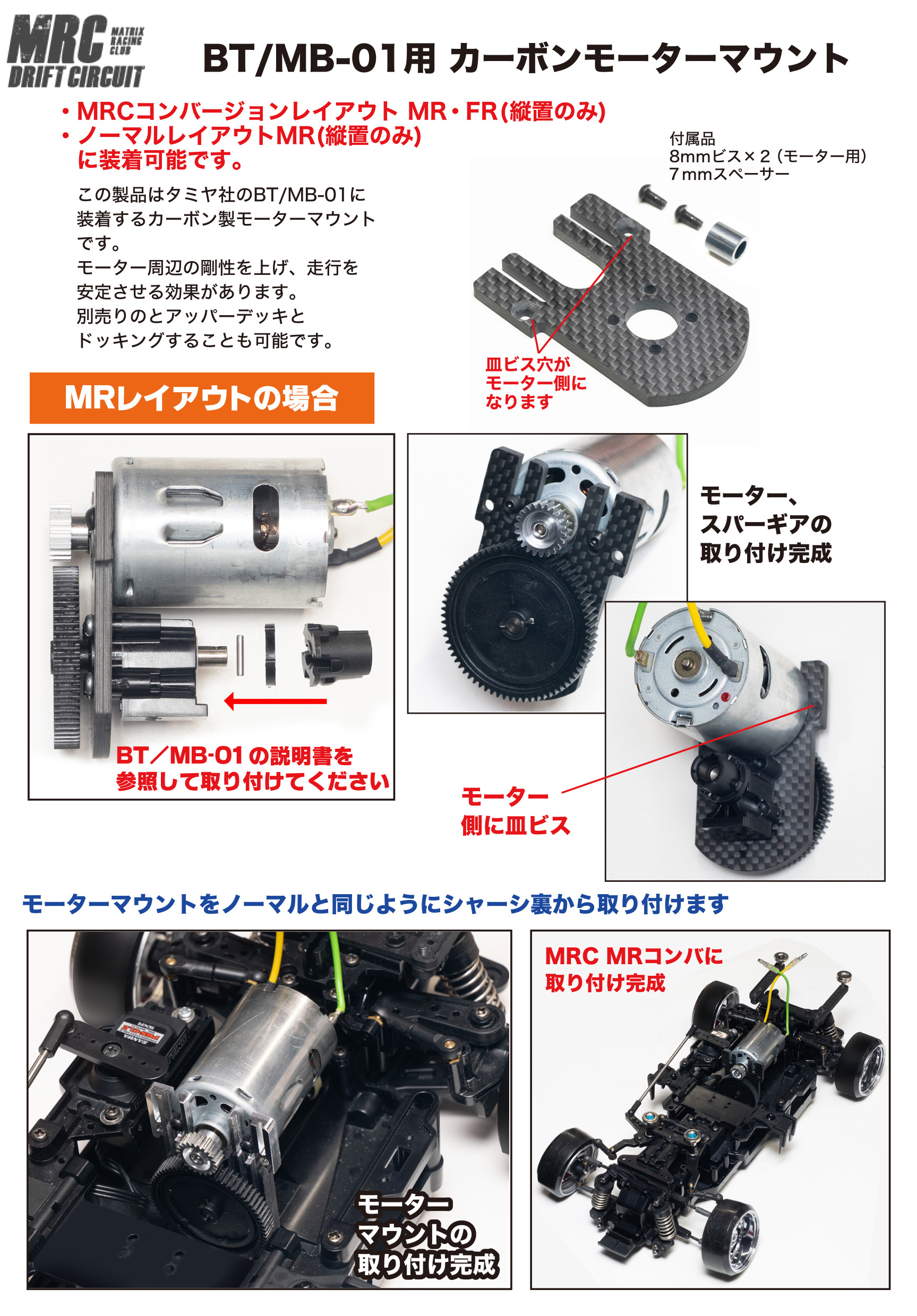 この製品はタミヤ社のBT/MB-01に装着するカーボン製モーターマウントです。 モーター周辺の剛性を上げ、走行を安定させます。