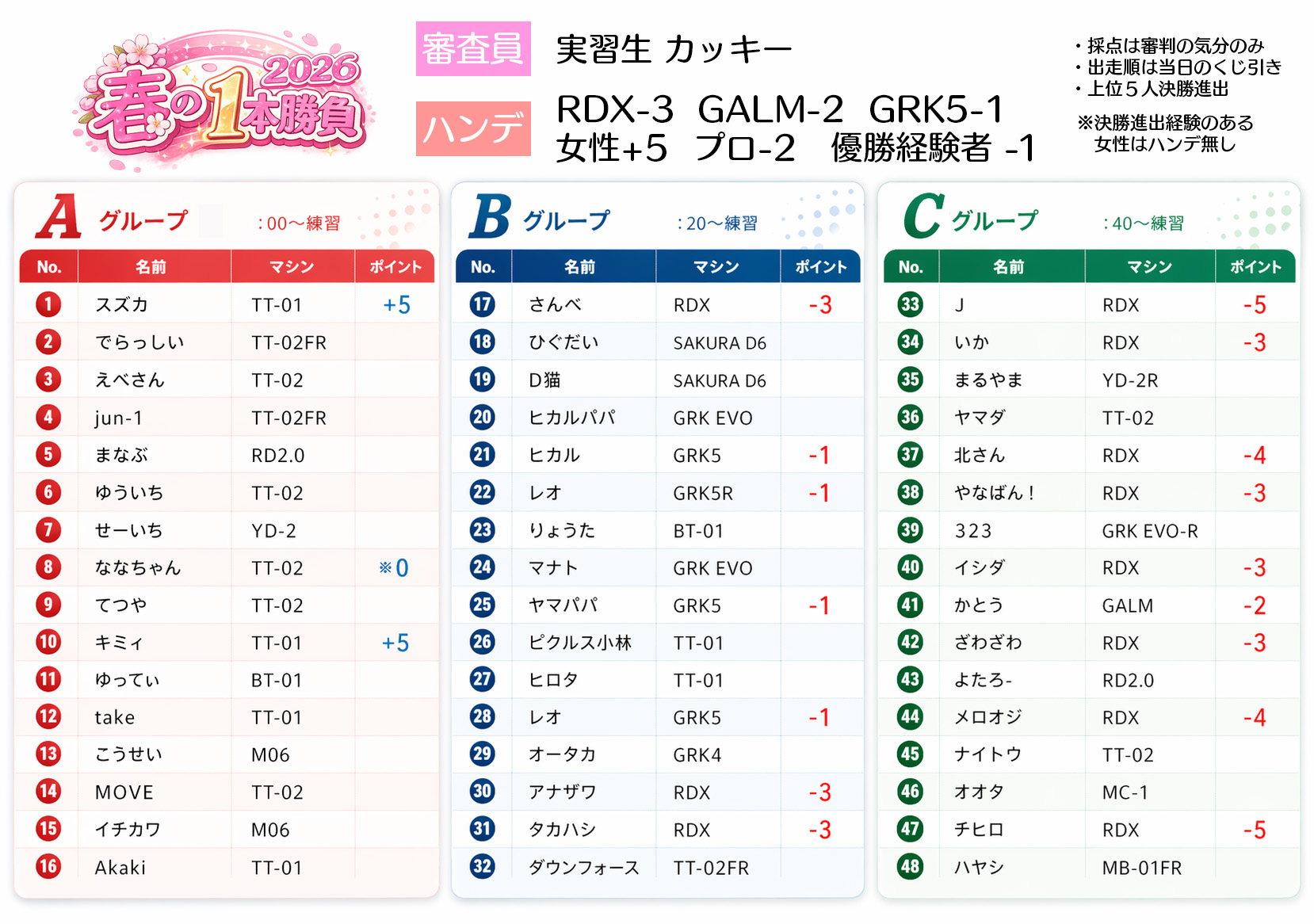 ・ハンデ RDX-3 ・GALM-2・GRK5-1・女性+5・プロ-2・優勝経験者 -1