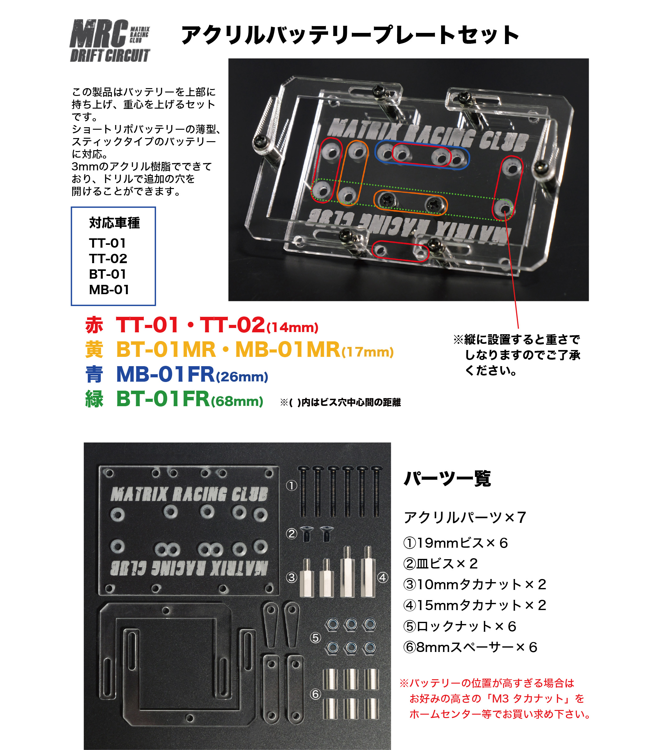 ビス穴はタミヤのTT-01・TT-02・BT-01・MB-01に対応しています。
