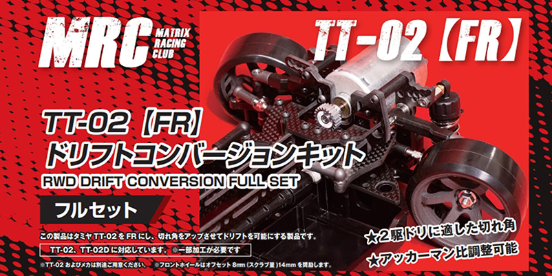 タミヤTT-02を後輪駆動の2駆にし、フロントタイヤの切れ角をアップさせる製品です。 TT-02の車体およびメカは別途ご用意ください。