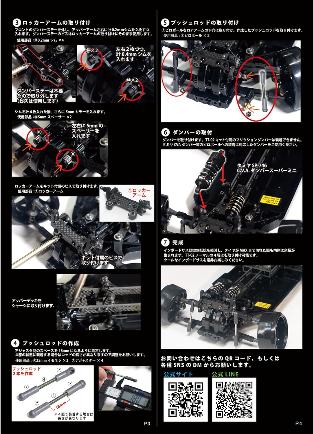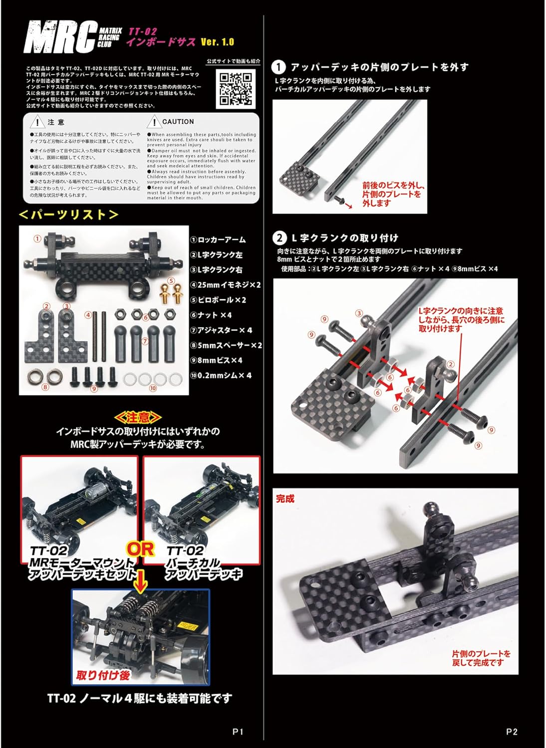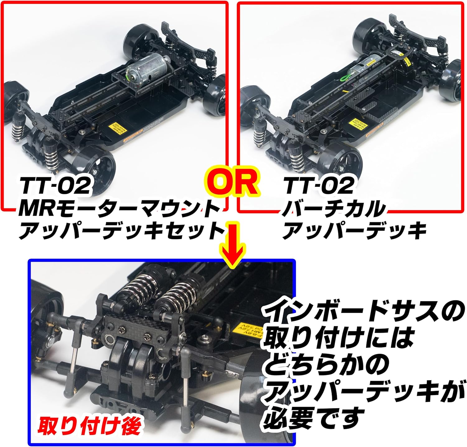 TT-02 インボードサスペンションセット TT02 タミヤTT-02用のインボードサスペンションキットです。 この製品はタミヤTT-02、TT-02Dに対応しています。取り付けには、MRC TT-02用バーチカルアッパーデッキもしくは、MRC TT-02用MRモーターマウントが別途必要です。 空気抵抗を減らし、タイヤがMAXまで切れた時にダンパーへの干渉を避けることができます。 MRC 2駆ドリコンバージョンキット仕様はもちろん、4駆の状態でも使用できます。 品番:MRCTT02ISS amazon 商品一覧