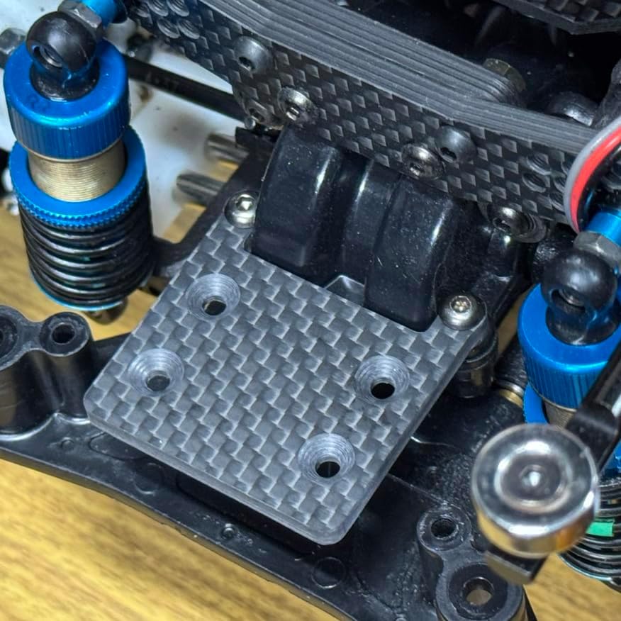 TT-02のリアに装着するマルチプレートです。 ESCマウントや、ウェイトマウントとして活用できます。 皿ビス仕様になっているので下側にビス穴付きのウェイトを取り付け、その上にESCという仕様も可能です。